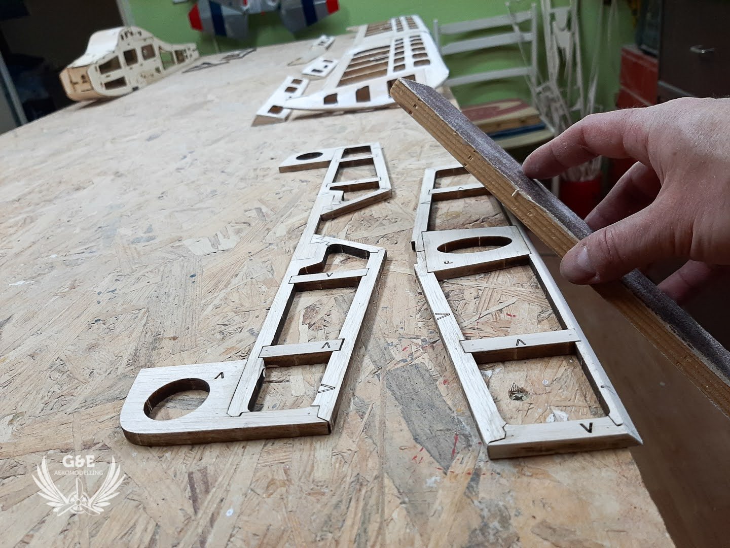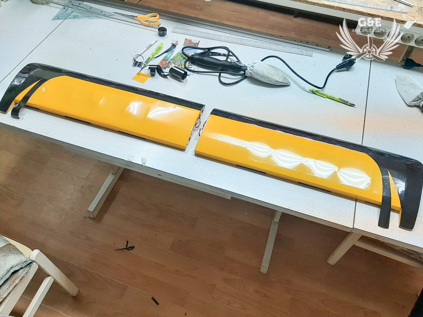 A vágat simára csiszolása után a szárnyakra felragasztottam a kilépőéleket, a csűrőkre, ívelőkre pedig a belépőéleket