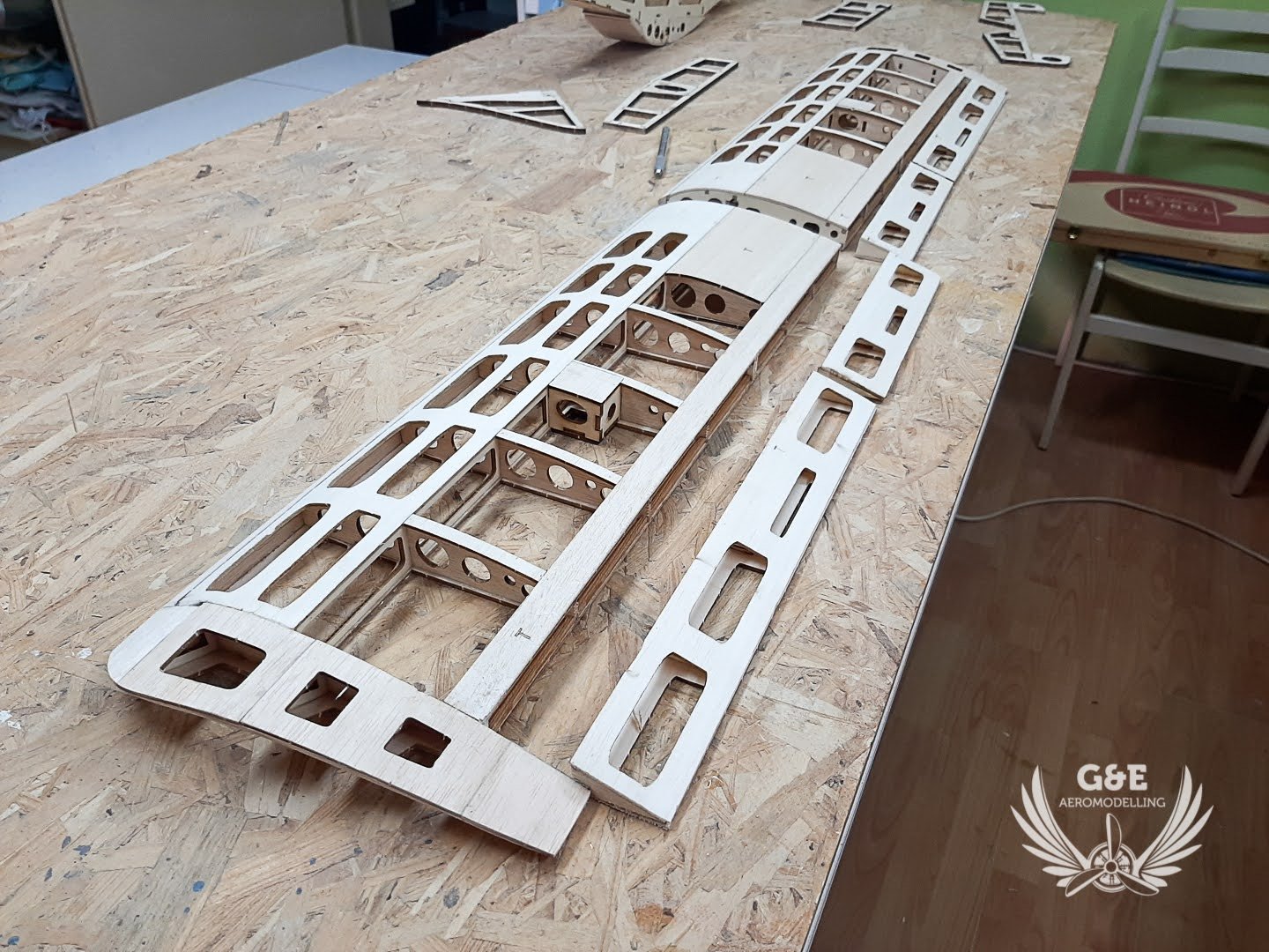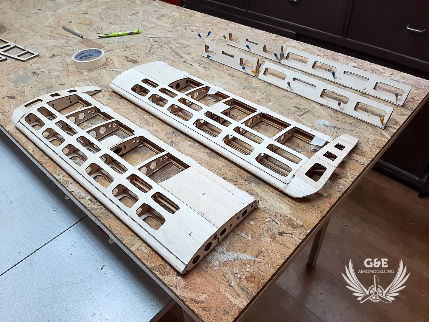 A vágat simára csiszolása után a szárnyakra felragasztottam a kilépőéleket, a csűrőkre, ívelőkre pedig a belépőéleket