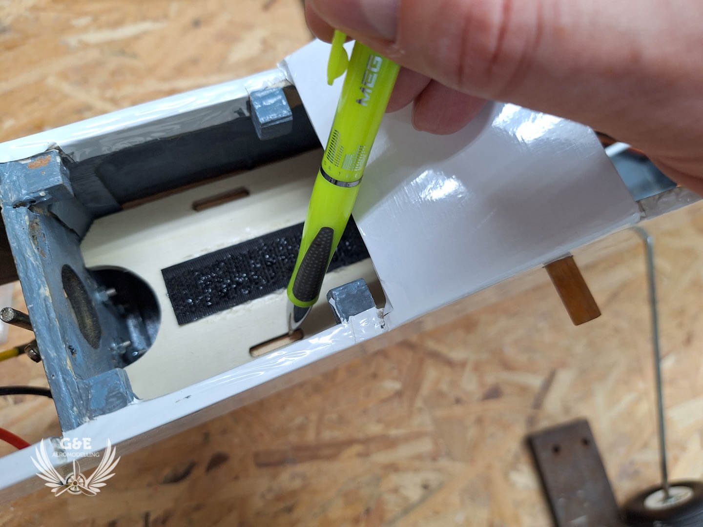 A motor rögzítésére beragasztottam egy 8mm vastagságú rétegeltlapot. A régi és az új tűzfal közötti részt egy fedéllel csuktam le. Ez a fedél alatt van hozzáférés az első futóhoz illetve a motort rögzitő csavarokhoz is. Ezen a fedélen kapott helyet a zát is, ami helyén tartja az akksi fedelét is