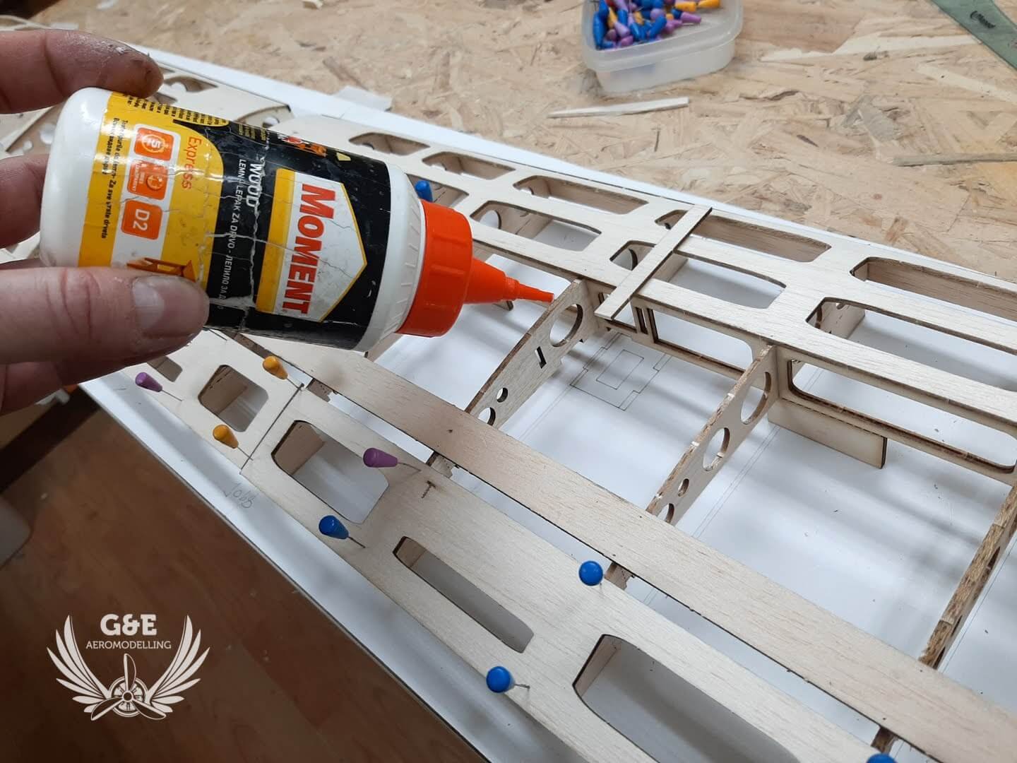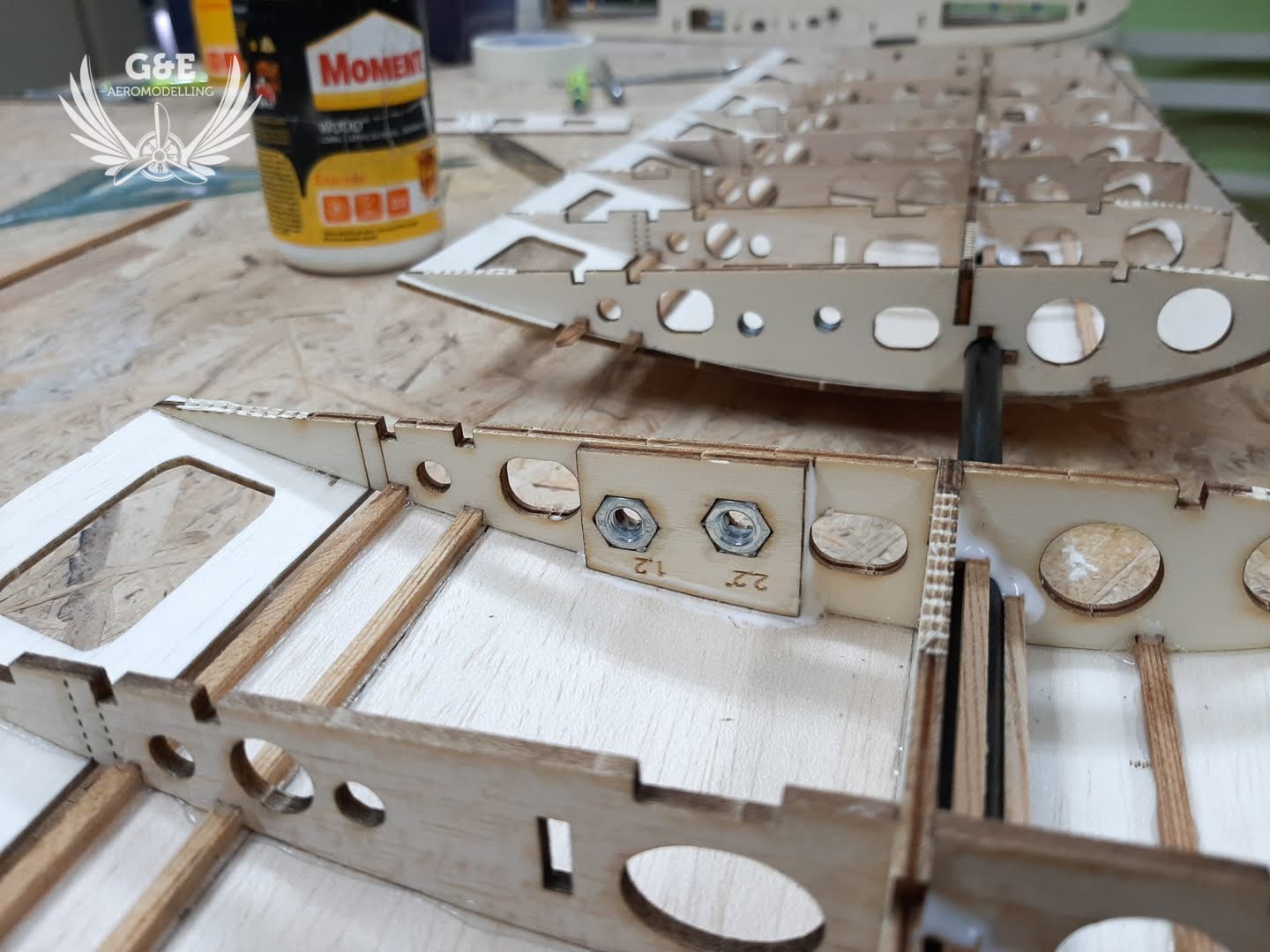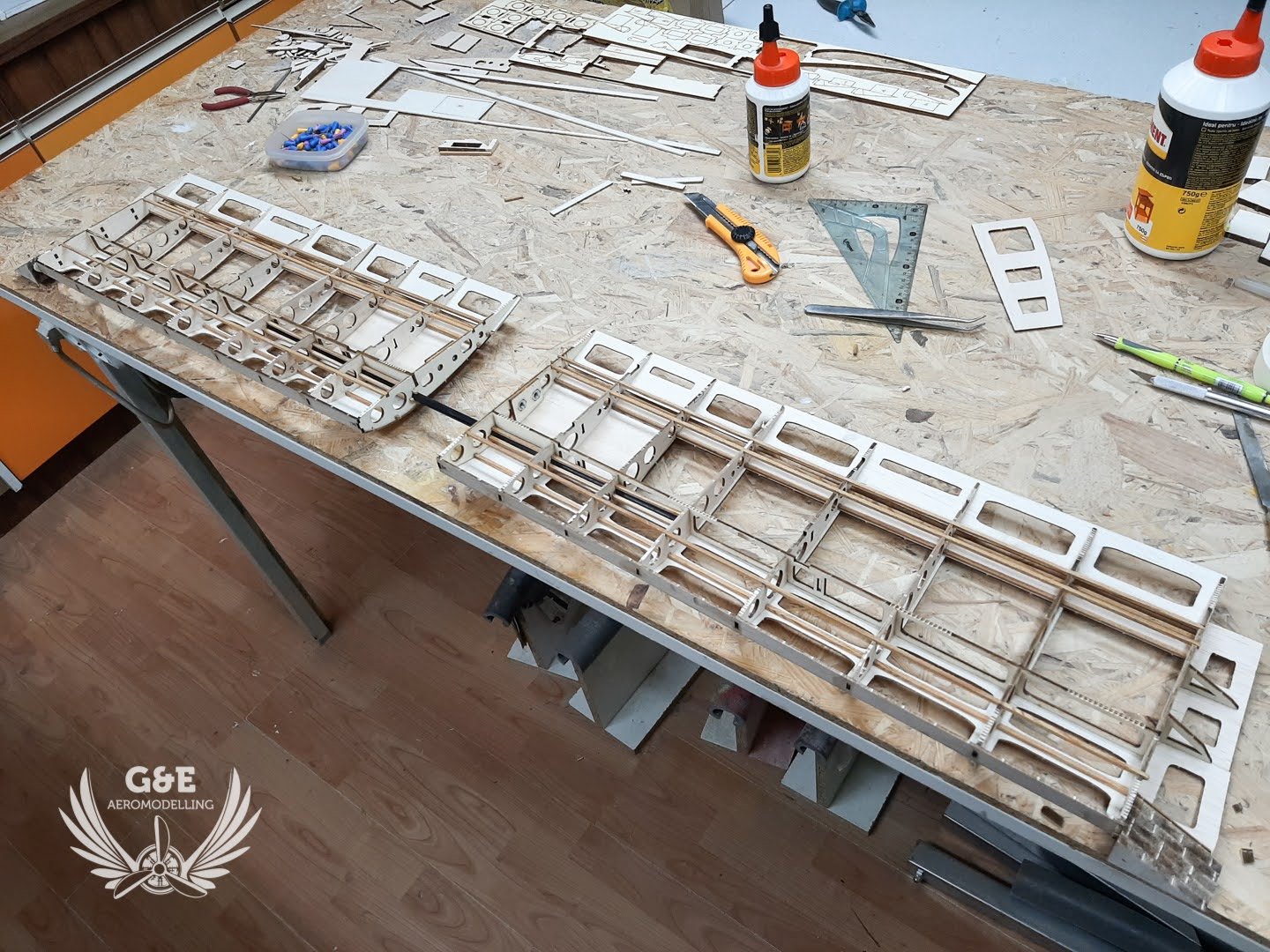 A szárny felszedése után összeraktam és a helyükre ragasztottam a szervókereteket és a szárnyrögzitő anyacsavarokat