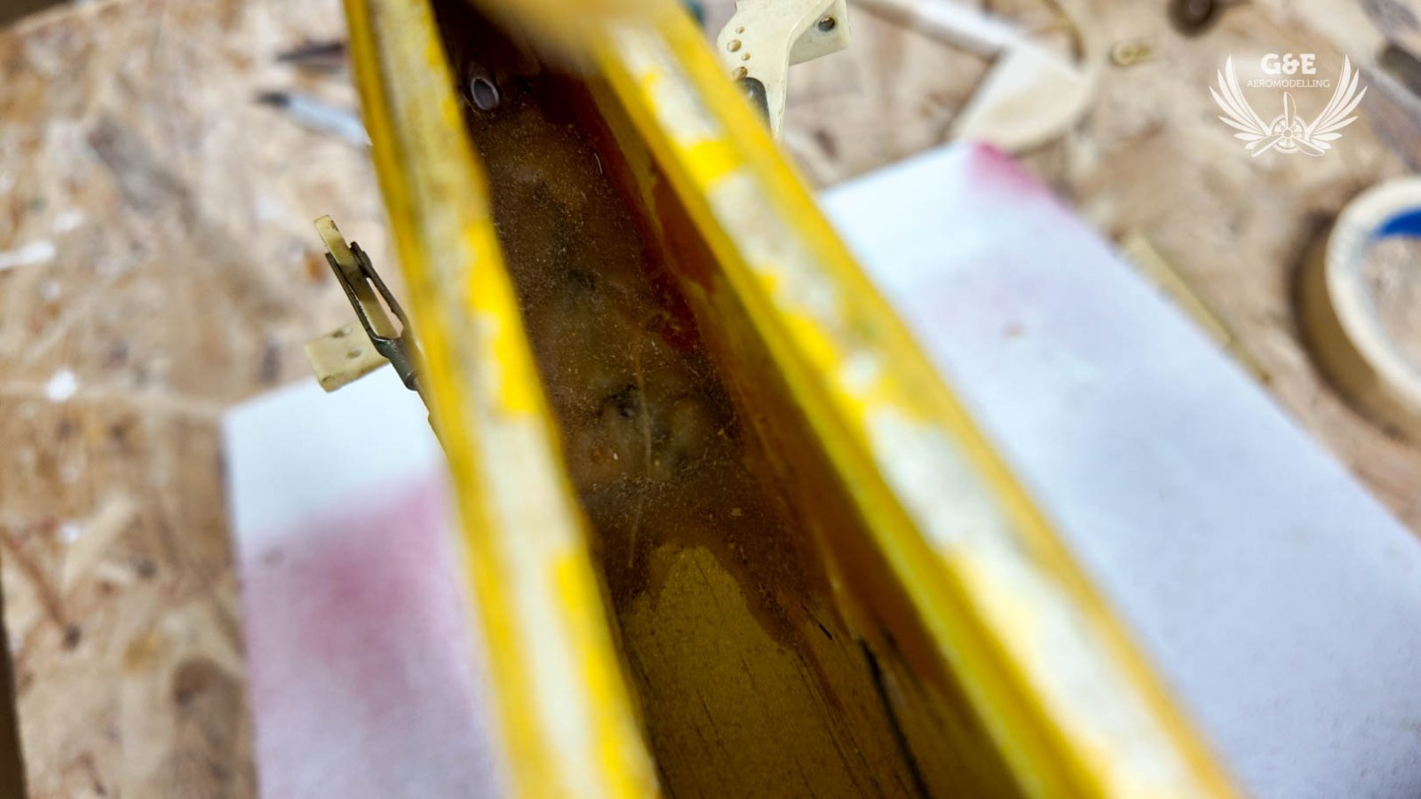 Elképesztő mennyiségű ragasztó volt belocsolva a törzs végébe. Mire mindet sikerült kitakaritanom, a törzs oldalán levő palánk belső felülete pár helyen megsérült